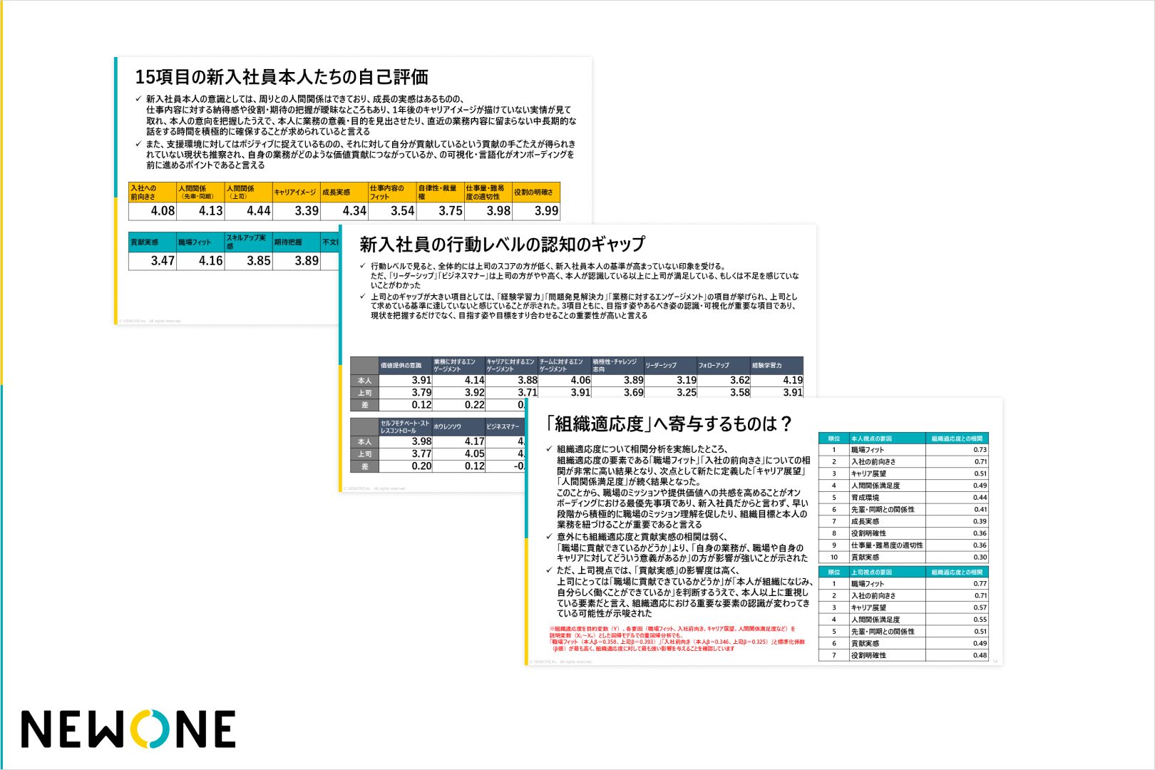 この資料でわかること 本資料は、NEWONEで実施の「PANAIサーベイのデータ」を分析し、より良いオンボーディングをするために何が必要かをまとめたものです。 15項目の新入社員本人たちの自己評価 15項目に対する上司とのギャップ 新入社員の行動レベルの認知のギャップ 「組織適応度」へ寄与するものは?
