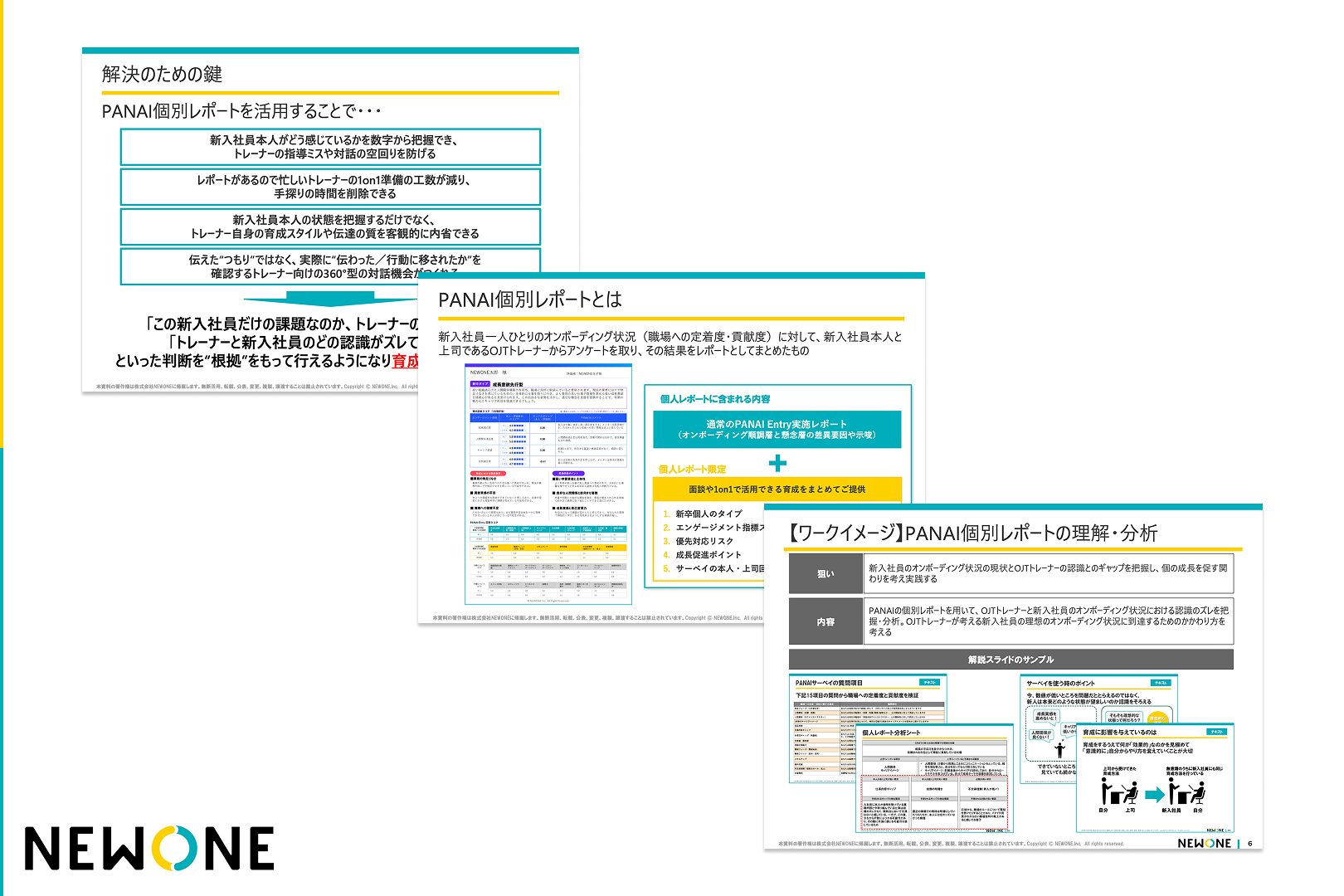 新入社員の本音と実情への理解を通してトレーナーの育成力を向上させる、PANAIサーベイ個別レポートを活用したOJTトレーナー向け研修プログラムのご案内資料です。