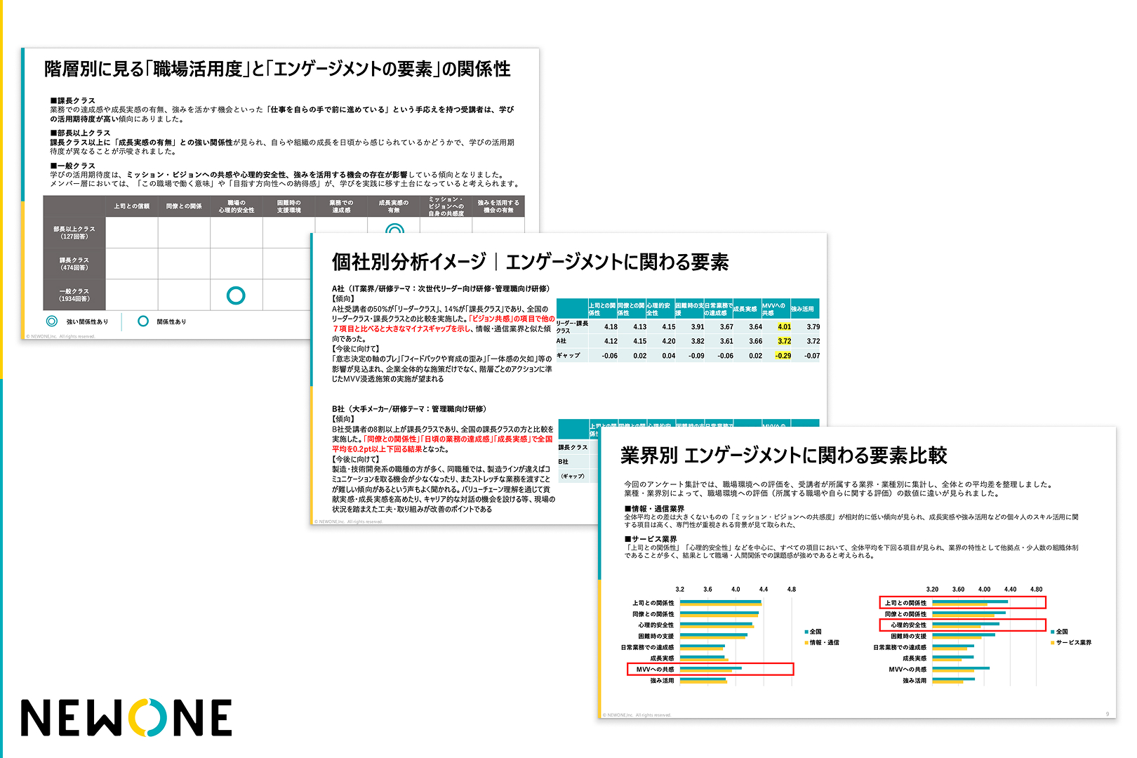 この資料でわかること 本資料は、NEWONEによる「 学びを『職場で実践できそう』と感じる、研修受講者の共通点とは 研修受講者アンケート分析レポート」の結果をもとに作成しています。以下のような切り口から、研修受講後の社員の実態について分析しています。 受講者が研修での学びを活用できると思える条件 受講者の階層によって異なる、研修実践を後押しする要因 業種・業界によって異なる、エンゲージメントに関わる要素