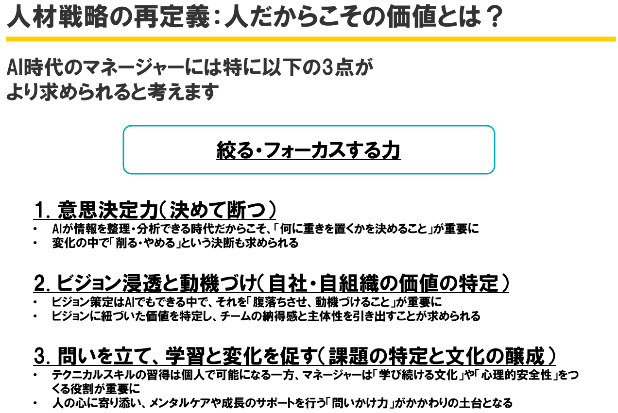 例えばAI時代に求められる良いマネージャーの要素は以下のように変化していくと想定しています。
