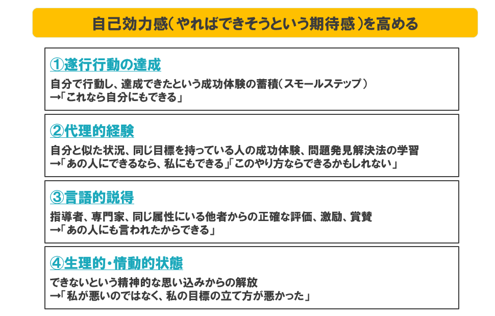 この自己効力感を高めることが、主体的な行動へとつながっていきます。