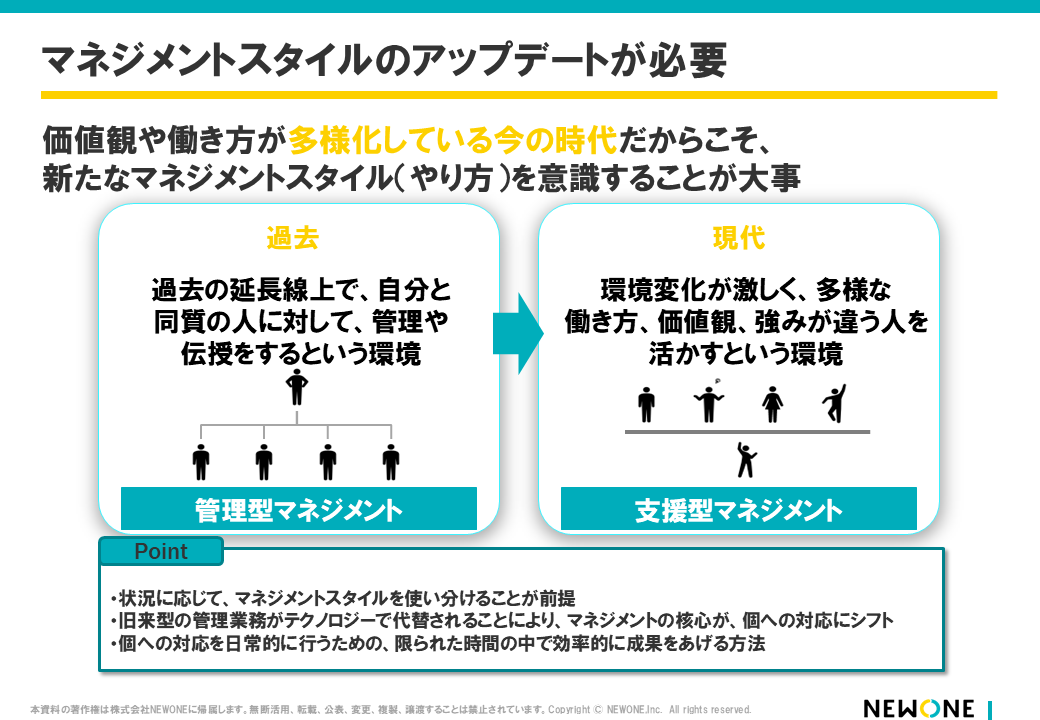とはいえ、そもそも従来のマネジメントスタイルが何か、どのような認知転換が必要なのかを具体的に理解したうえで、伝える必要があります。