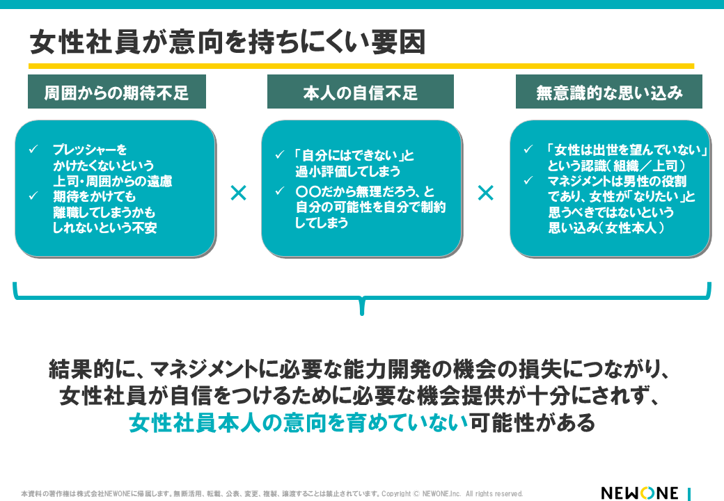 結果的に、マネジメントに必要な能力開発の機会の損失につながり、女性社員が自信をつけるために必要な機会提供が十分にされず、女性社員本人の意向を育めない環境が生まれてしまいます。