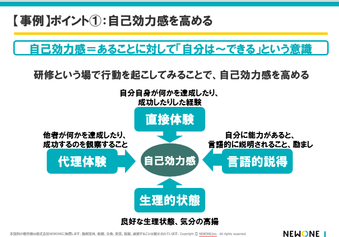 - 日常的にフィードバックを積み重ねて「自分にもできそうだ」という感覚(自己効力感)を育むこと
