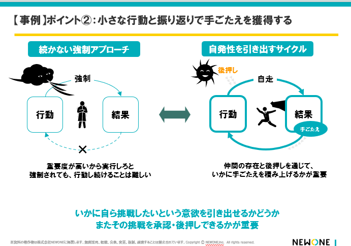 - 「手ごたえの積み重ね」というワードや、上司にアプローチするという点は新たな気づきでした。