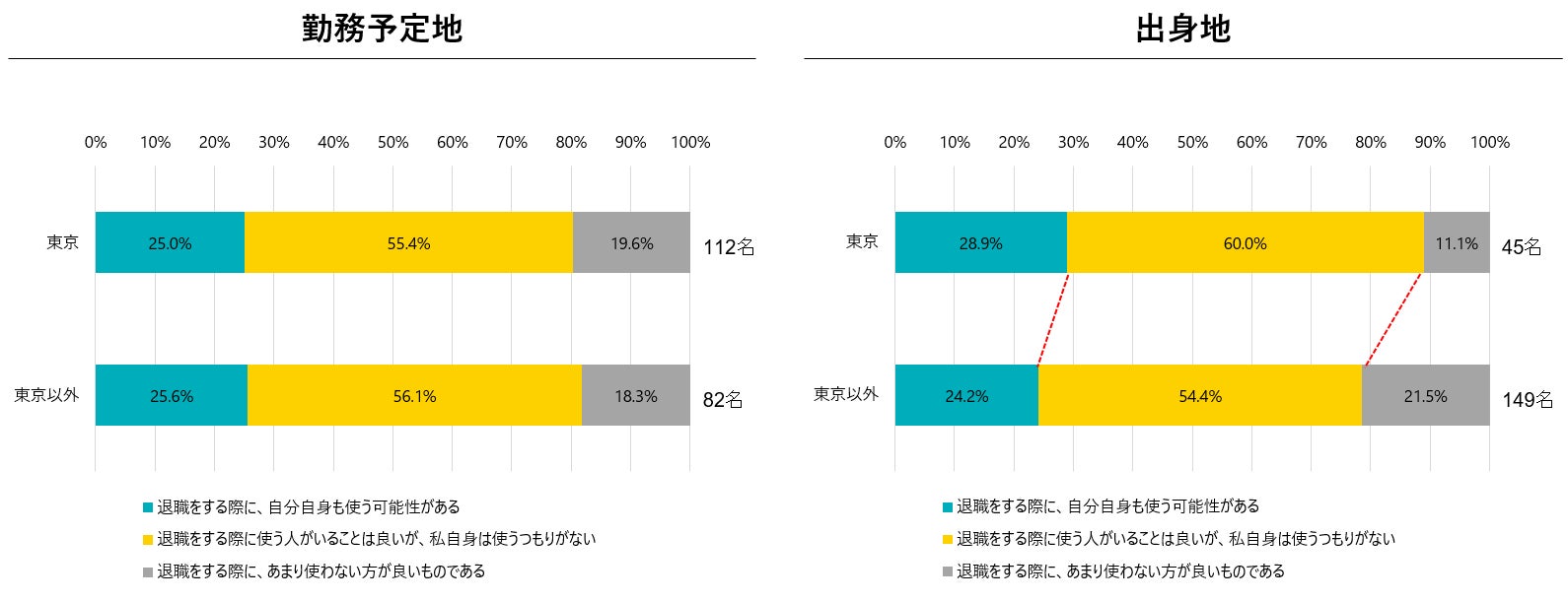 勤務予定地で見ると、東京とそれ以外で大きな差はみられない。一方で、出身地で見ると、東京都出身はそれ以外のエリアと比べて、利用可能性が4.7ポイント高く、利用すること自体良いととらえている人が10.4ポイント高い。