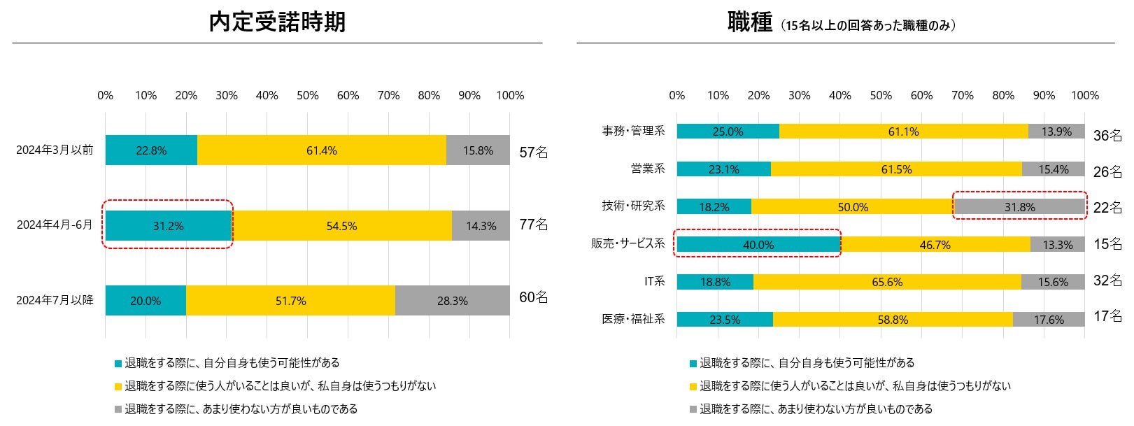 内定受諾時期別で見ると、2024年4月-6月に受諾している人が、利用可能性は31.2%と最も高い。職種で見ると、販売・サービス系が利用可能性が40.0%と最も高く、技術・研究系は31.8%が利用を否定的に捉えている。