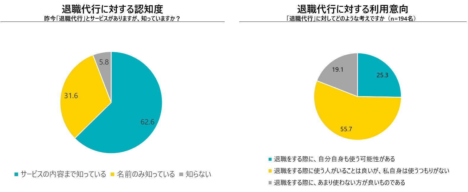 退職代行に対する認知度は94.2%と、ほぼすべての25新卒入社者が知っている。利用意向としては、4人に1人は自身が使う可能性があると捉えていて、また81%が退職代行を使うことに否定的ではない実態である。