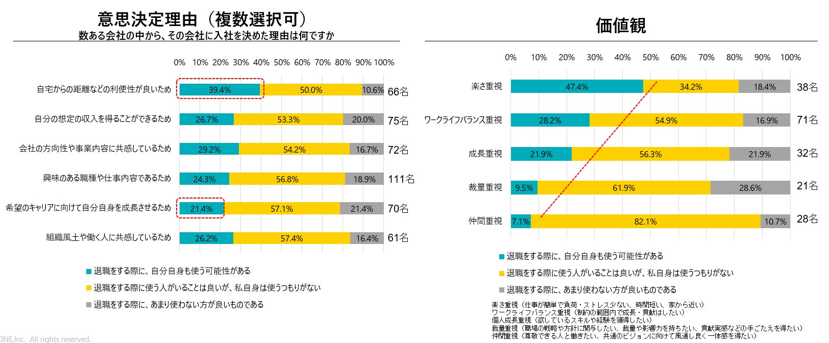 内定受諾の意思決定理由別にみると、距離などの利便性が理由の場合39.4%と利用可能性が高く、希望のキャリアの場合は21.4%と利用可能性が低い。本人の働く価値観別にみると、楽さ重視が47.4%と高く、仲間重視が7.1%と低く、本人の価値観が大きく影響しているのがわかる。