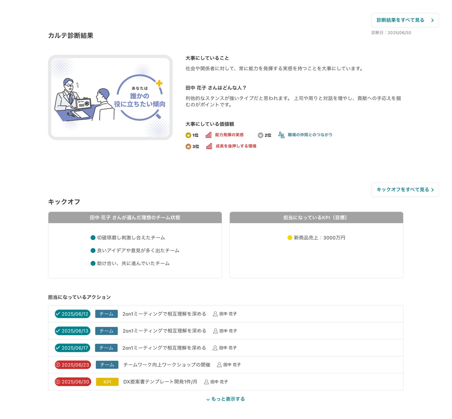 また、働く上での価値観を診断できる「Cocolaboカルテ」や、キックオフミーティングツール「Cocolaboキックオフ」の利用結果もプロフィールと連動して表示され、各メンバーのCocolaboでの活動状況が一目で把握できるようになりました。