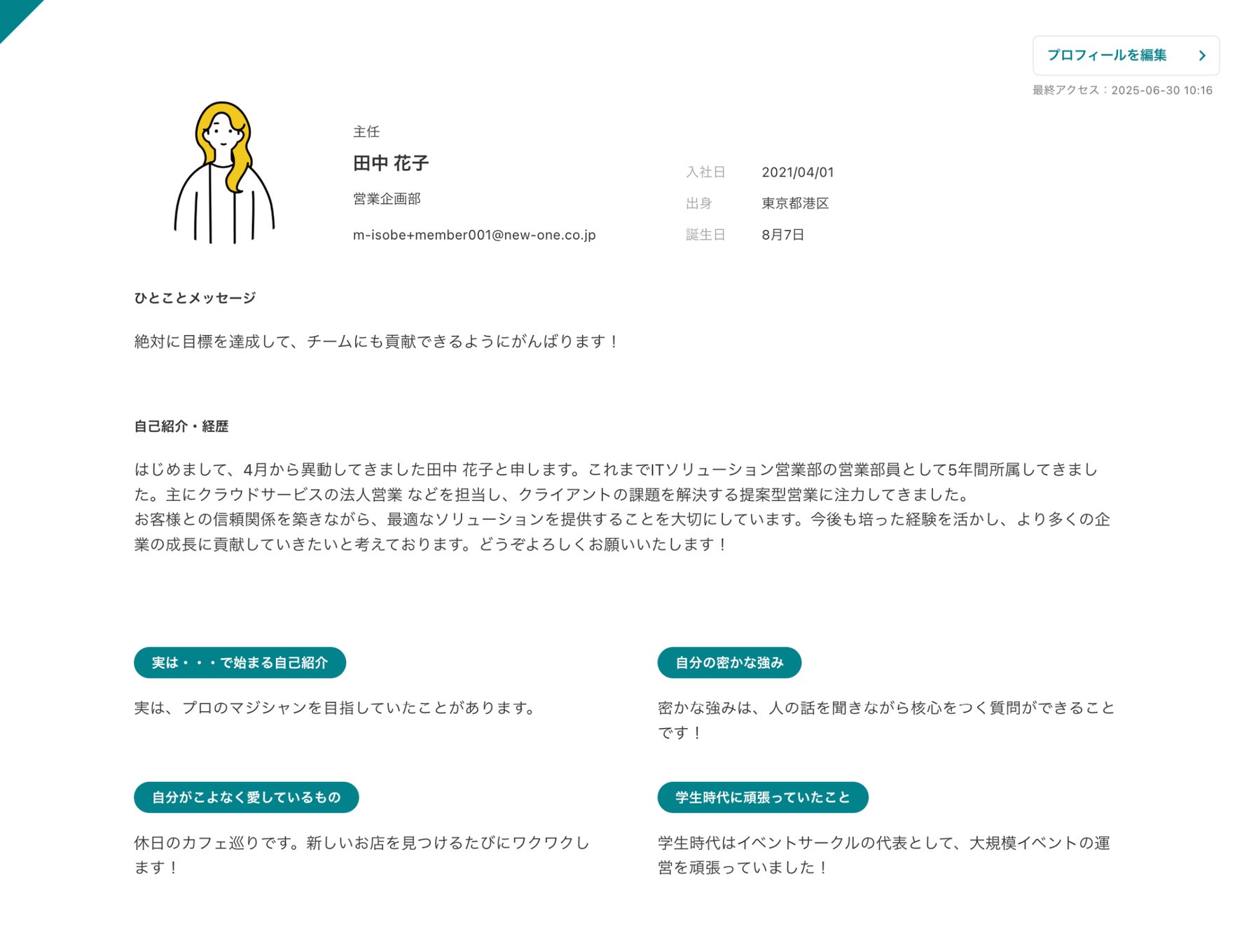 今回のアップデートにより、チームメンバーそれぞれのプロフィール情報を登録・共有できるようになりました。チーム立ち上げ時や新しいメンバーが加わった際にプロフィール情報を登録しておくことで、メンバーがいつでも自由にお互いのプロフィール情報を閲覧でき、相互理解を深めることができます。