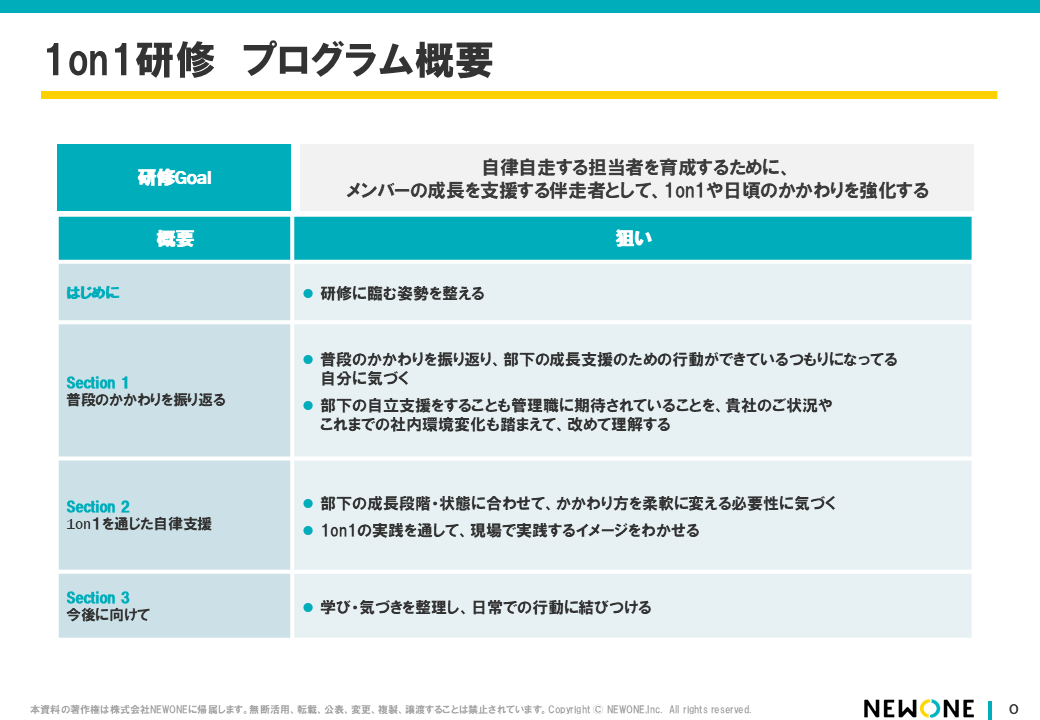 そこで今回は、「1on1=雑談」というイメージを刷新し、“成長支援”と“自律自走に向けた伴走”をテーマに、改めてNEWONEさんに研修をお願いしました。
