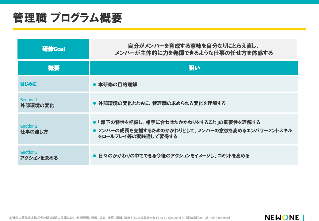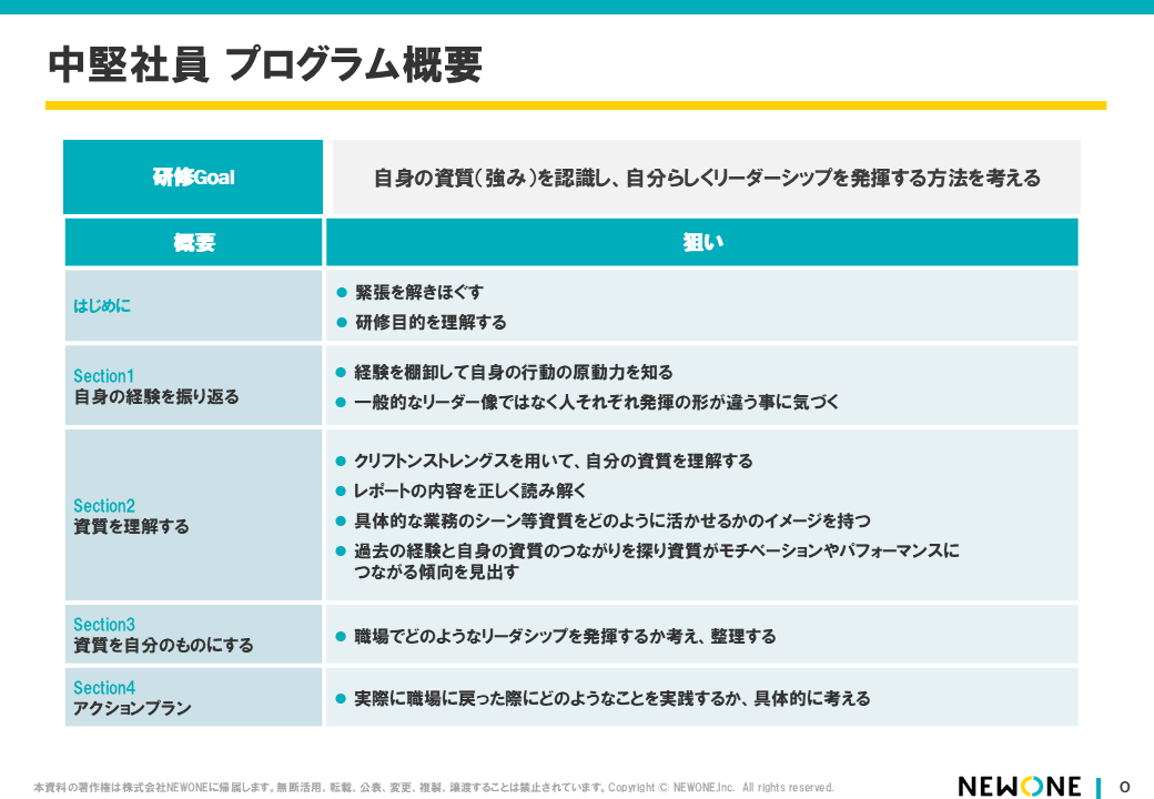打木様:NEWONEさんにご依頼した一番の理由は、研修の設計段階から当社の現状や課題感を非常に丁寧にヒアリングしていただき、各階層にとって本当に必要なプログラムを一緒に検討してもらえた点です。中堅社員・管理職・上級管理職それぞれに求められる役割やテーマを踏まえたうえで、研修内容を設計していただけたことが、大きな決め手になりました。