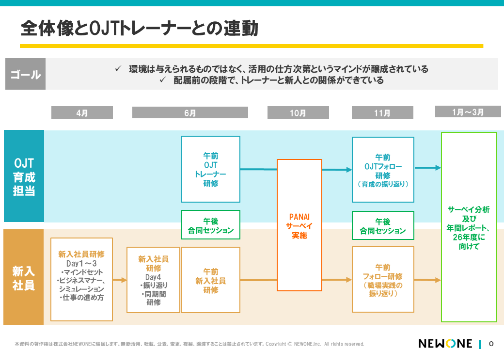 新入社員とOJTトレーナーを対象に、4月の新入社員研修、5月の合同研修、11月の合同フォローアップ研修を実施。PANAIサーベイを活用し、新入社員の傾向分析や個別レポートを作成。数値データをもとに相互理解を深め、OJTの質向上と育成のブラッシュアップを図る育成施策として展開。