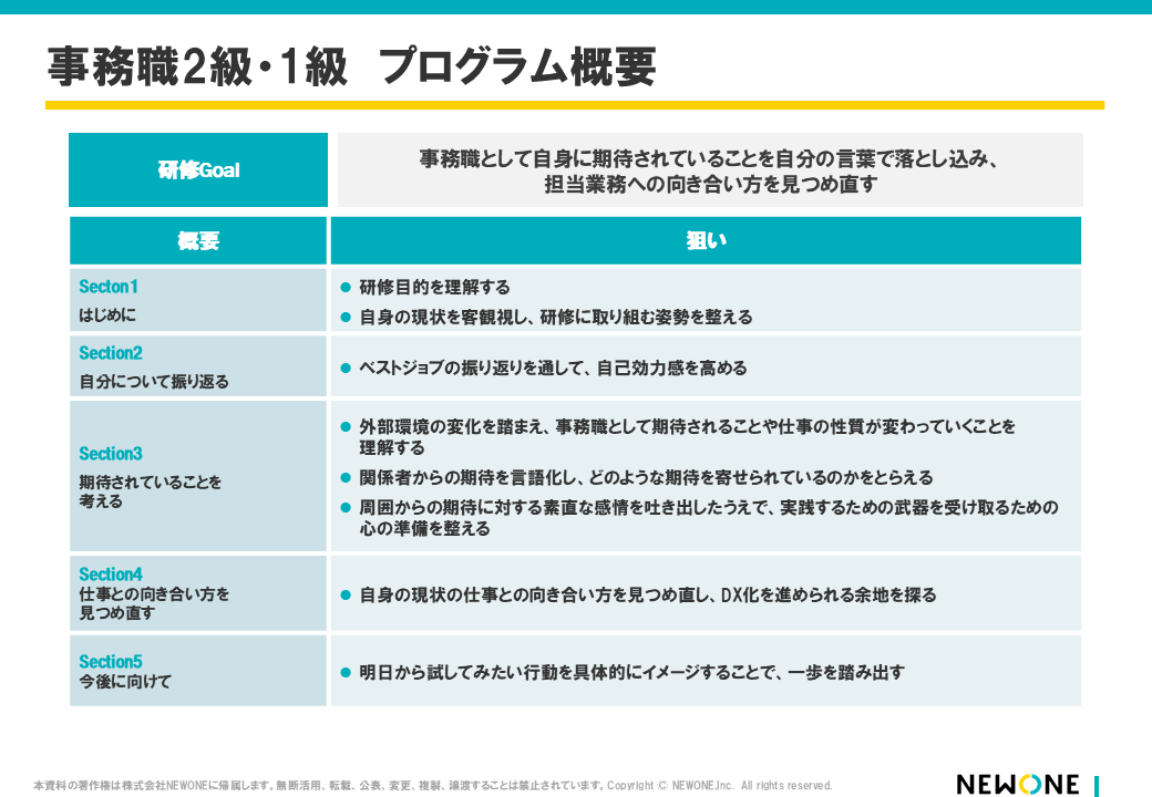 - 事務職向けの研修機会がほとんどなく、役割や期待を改めて整理する機会が不足していた。日常業務に追われ、自身の成長や組織への関わりを見つめ直す機会が少ない状況だった。