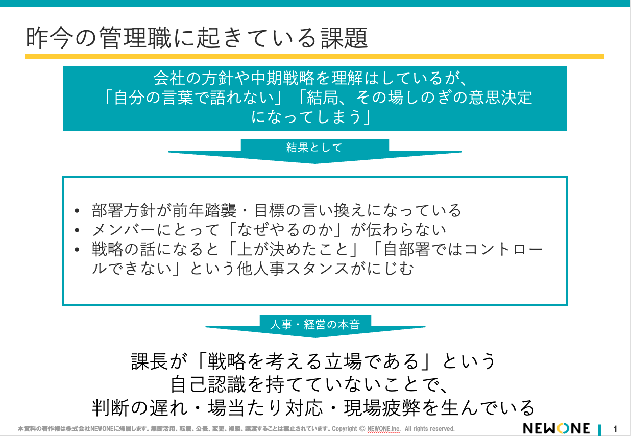「自分たちは戦略を考える立場でもある」という当事者意識が欠如している。難しい局面において「自部署ではコントロールできない」「上層部の決定だから」といった言い訳が先行し、自らが矢面に立って組織を牽引する姿勢が弱まっている