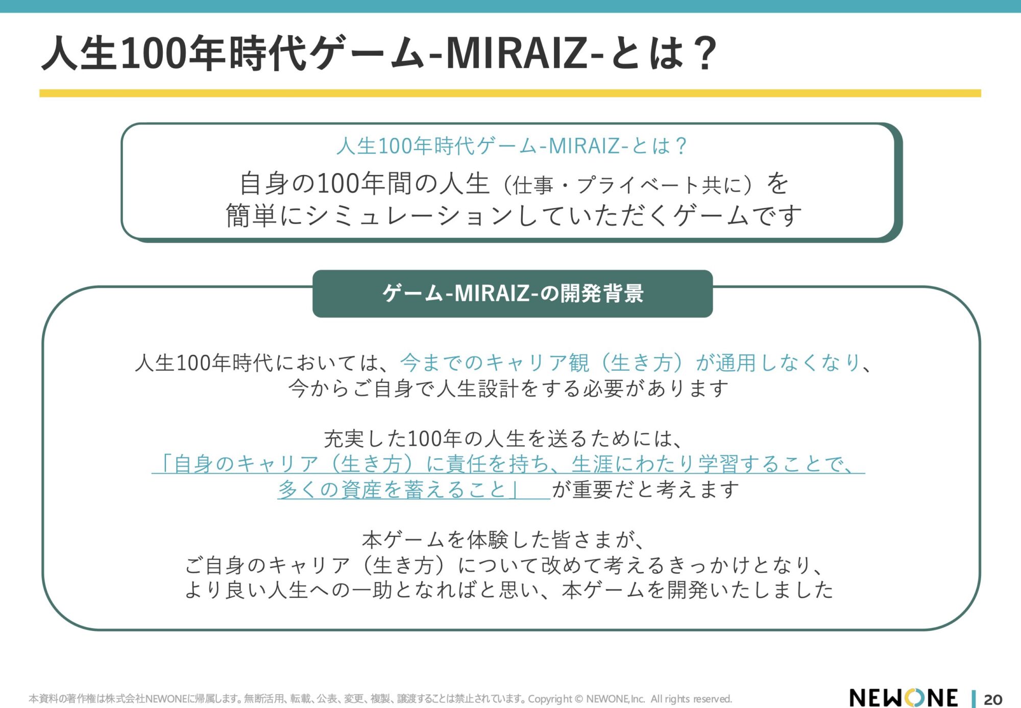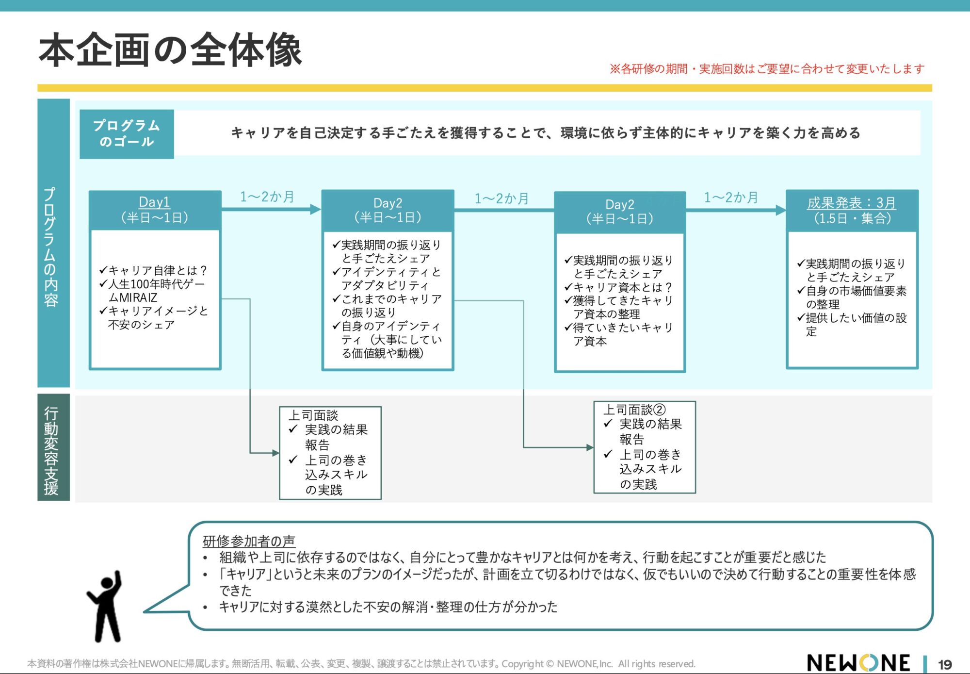| 【Day1】 キックオフ・意識醸成 | キャリア自律の必要性を自分事として捉え、自己決定の重要性を体感する | ・時代背景の理解 ・ゲーミフィケーション「MIRAIZ」の実施 ・人生100年時代の資産変化と自己決定の振り返り |