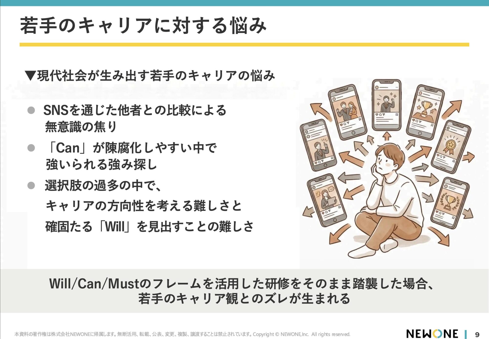 従来の「夢ややりたいこと(Will)」を無理に引き出そうとするキャリア研修では、かえって若手社員自身にに苦痛を与えるものとなってしまい、若手世代の状況に応じた対応ができていない