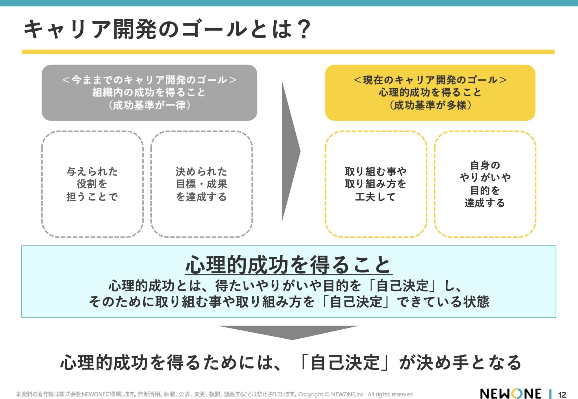 キャリアを「会社任せ」ではなく「日々の主体的な選択の積み重ね」と捉え直し、環境に左右されず自ら動くことができている状態。自身の価値観に基づき今の仕事に目的を見出すし、納得感(心理的成功)を持って業務に励み、組織の成果と個人の成長を両立させる自律型人材への転換を促します