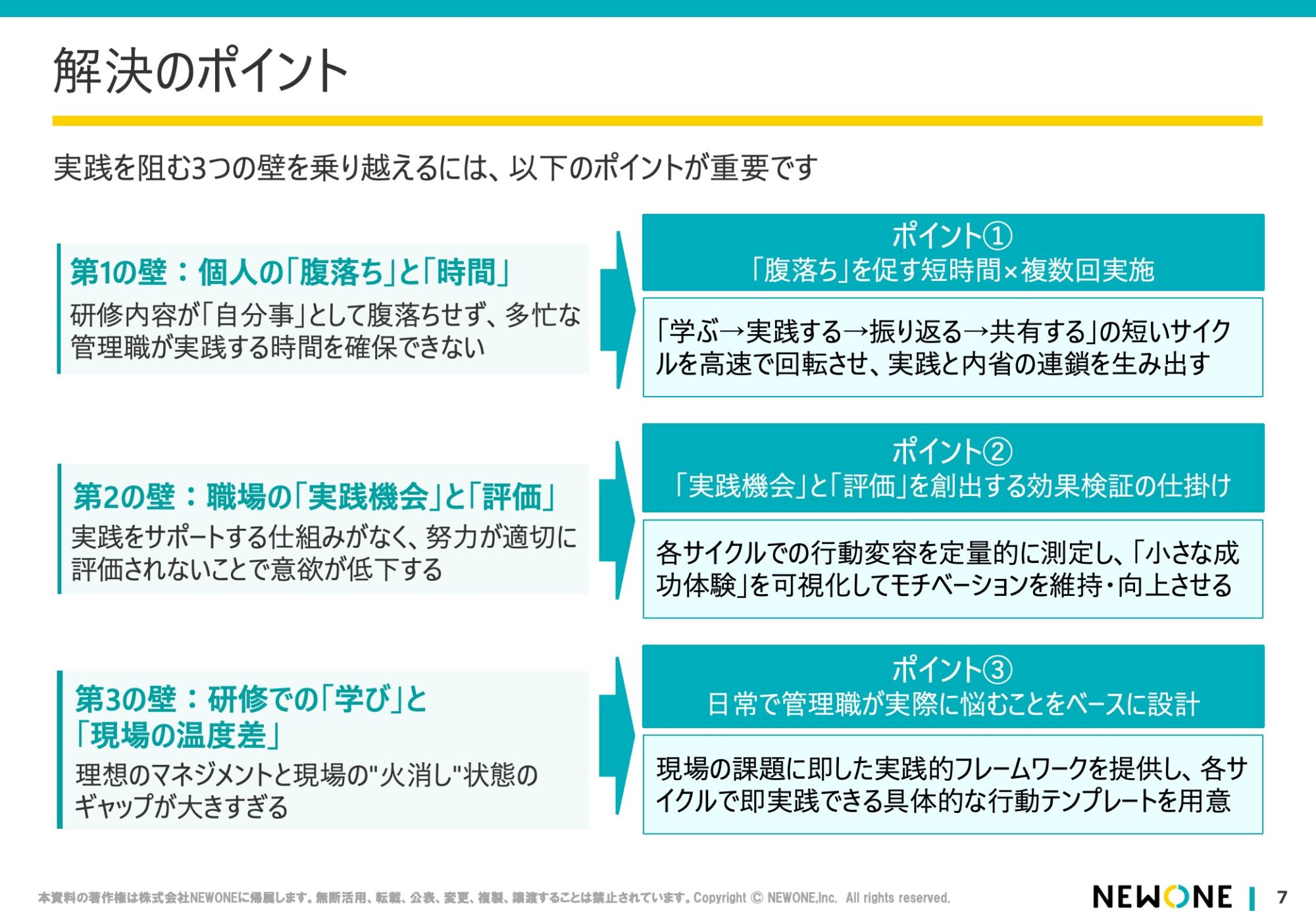 - 従来の「やりっぱなし」で終わる管理職研修の課題を解決し、短期間で何度もサイクルを回す継続的な学習プロセスにより、確実に職場での実践と成果につなげます。
